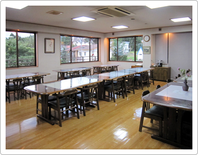お食事はこちらの食堂のご利用となります。開放感のある食堂で、越路の地産地消の食事をどうぞ。