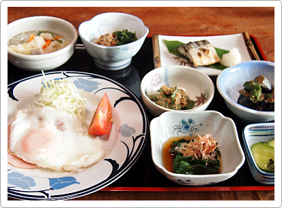 朝日の差し込む食堂には入れたてのコーヒーと手作り朝食が待っています。あなたもどうぞ越路の朝ごはんを食べにきてください。