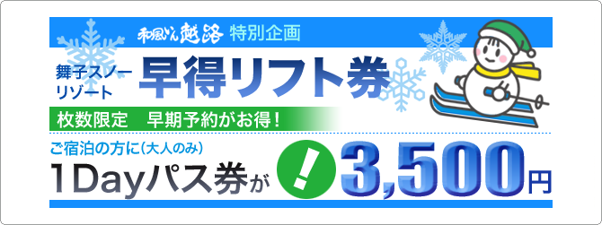 日曜日~金曜日のいずれか平日扱い日に4名様以上(小学生以上)でお泊まりのグループに、リフト1日券を1枚プレゼントいたします。